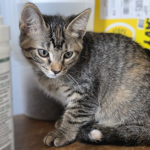 I am here with my siblings, we are very playful together but I am not very outgoing with visitors yet. We were sick for a little while and weren't allowed to have visitors, but now we can meet people. I am curious but hold back and watch my sisters interact with humans, I think I get it but it is very new to me. I will need a home with a patient person who will allow me to slowly get used to my new home. If you have the time to help ease me into your home, please put in an application today.
